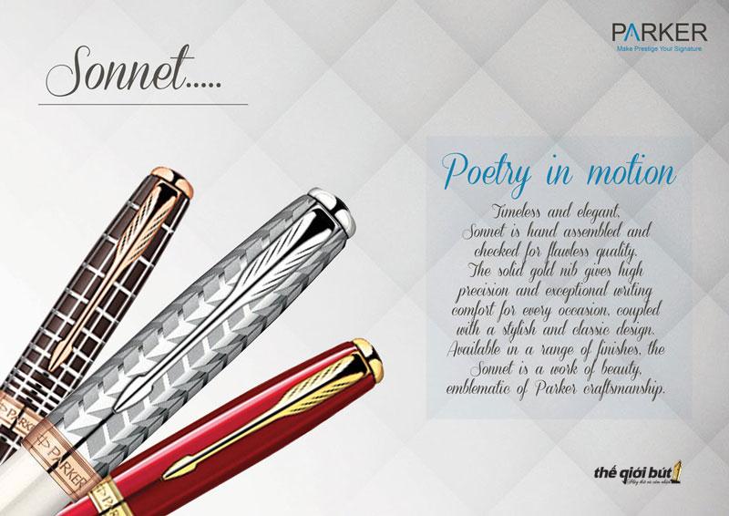 Ra đời vào năm 1993, dòng Sonnet là dòng viết có doanh số bán tốt nhất. Lấy cảm hứng thiết kế từ những người mẫu nổi tiếng của quá khứ, Sonnet là sự kết hợp tinh tế với công nghệ sản xuất mới. Vượt thời gian và thanh lịch, từng chi tiết của Parker Sonnet được lắp ráp bằng tay và được kiểm tra chất lượng hoàn hảo. Ngòi vàng rắn chắc cho độ chính xác cao, Sonnet phù hợp cho tất cả các dịp, cùng với thiết kế thời trang và cổ điển. Dòng viết Parker Sonnet là tác phẩm nghệ thuật tuyệt đẹp, là biểu tượng của nghệ thuật chế tác thủ công viết Parker. Bút Parker Sonnet là cây bút thiết kế hiện đại tốt nhất và là một trong những bộ sưu tập thành công nhất của hãng Parker. Cây bút mang tinh túy của văn hóa viết với phong cách hiện đại, kích thước cân bằng vừa vặn với mọi bàn tay, chắc chắn bạn sẽ cảm thấy thoải mái khi viết.