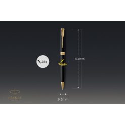 Bút bi bấm Parker Sonnet Matt Black GT Ballpoint Pen có kích thước tiêu chuẩn dài 133mm, đường kính thân 9.5mm và trọng lượng 28gam. Với kích thước cân bằng vừa vặn với mọi bàn tay, chắc chắn bạn sẽ cảm thấy thoải mái khi viết. Chiếc bút được trang bị một chiếc hộp Parker đi kèm rất sang trọng và tinh tế. Tạo nên sự đẳng cấp khi làm quà tặng cho sếp, lãnh đạo, người thân hay bạn bè.