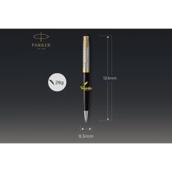 Parker Sonnet Premium Metal Black GT Ballpoint Pen 2119787 được làm bằng thép không rỉ được phủ nhiều lớp sơn mài cao cấp cho độ bền cao. Chiếc bút Parker 2119787 bao gồm 17 bộ phận được lắp ráp bằng tay một cách tỉ mỉ để có chất lượng hoàn hảo, mang lại độ chính xác cao và sự thoải mái khi viết. Vòng khoen, đỉnh đầu nắp và nắp đậy thân cùng với cài bút Parker Sonnet Premium với hình mũi tên đặc trưng cũng được mạ kim loại vàng quý giá sáng bóng và tinh xảo. Có thể nói, chiếc bút Parker Sonnet là một tác phẩm của vẻ đẹp, biểu tượng của nghề thủ công Parker, mang lai phong cách tinh tế cho mọi dịp khi chúng ta viết lách.
