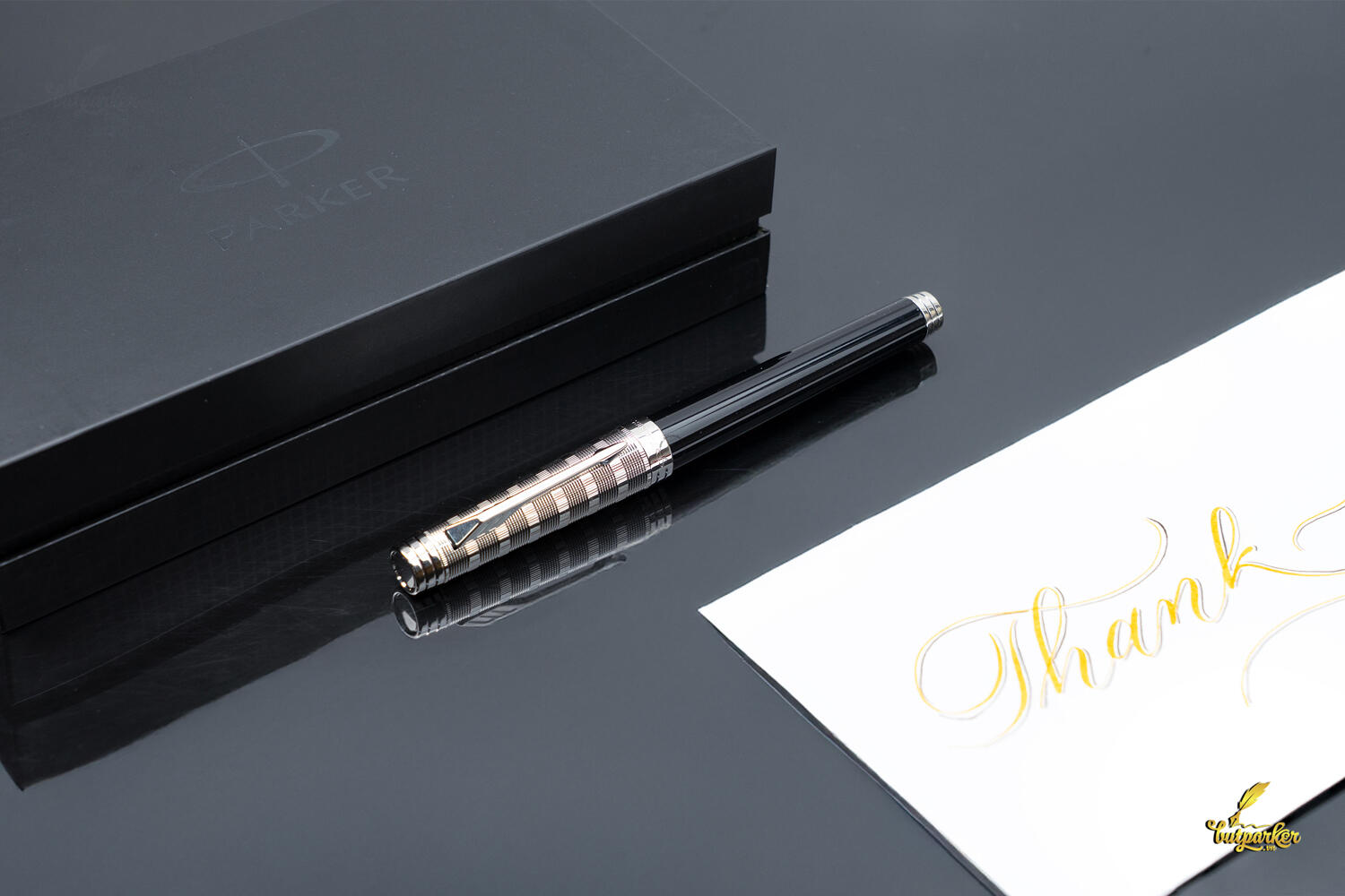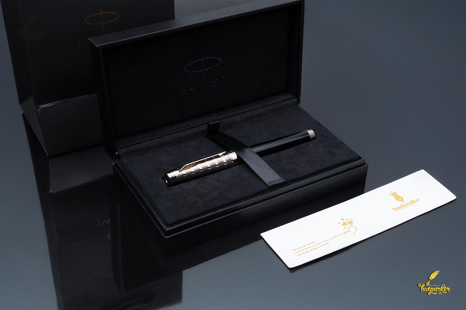 Chiếc Parker Premier Custom Tartan Rollerball 1931419 gây ấn tượng mạnh ngay từ cái nhìn đầu tiên nhờ thân bút sơn mài đen bóng được đánh bóng thủ công, phản chiếu ánh sáng như mặt đá quý. Nắp bút kim loại đem lại sự chắc chắn, cân đối khi cầm tay, thiết kế này mang đến phong thái thời thượng và chuyên nghiệp, phù hợp cho cả doanh nhân và người yêu chữ viết.