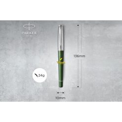 Bút máy Parker Urban 2017 Green CT Fountain Pen 1931617 có thân được làm bằng nguyên liệu cao cấp đồng thau. Đây là loại vật liệu được xem là cao cấp nhất hiện nay, có độ bền cực tốt – có thể chống lại mọi khả năng ăn mòn – chịu được tác động của môi trường… Bên cạnh đó lớp vỏ còn được phủ 1 lớp sơn mài cao cấp với nhiều màu sắc khác nhau cho bạn dễ dàng lựa chọn. Thiết kế hình viên đạn độc đáo, nổi bật về mặt thị giác và cân bằng hoàn hảo cho trải nghiệm viết thú vị.