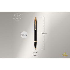 Sự pha trộn màu sắc hài hòa làm nổi bật lên phong cách thời trang lịch lãm của người sử dụng đặc biệt là tầng lớp thượng lưu trẻ tuổi. Viết bi Parker IM Core Black GT Ballpoint Pen có chiều dài tổng thể là 13.8 cm và đường kính thân 1.26cm. Trọng lượng của chiếc bút bi này khoảng 129g, khối lượng vừa phải giúp cho người cằm có cảm giác rất chắc tay.